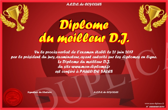 Envoyez par email votre Diplome du meilleur D.J. personalisé