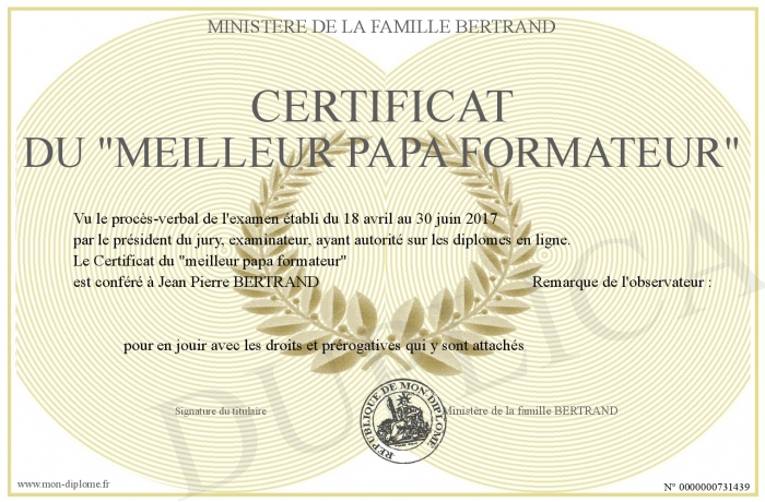 Envoyez par email votre Certificat du -meilleur papa formateur- personalisé