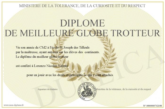 Envoyez par email votre Diplôme de meilleure globe trotteur personalisé