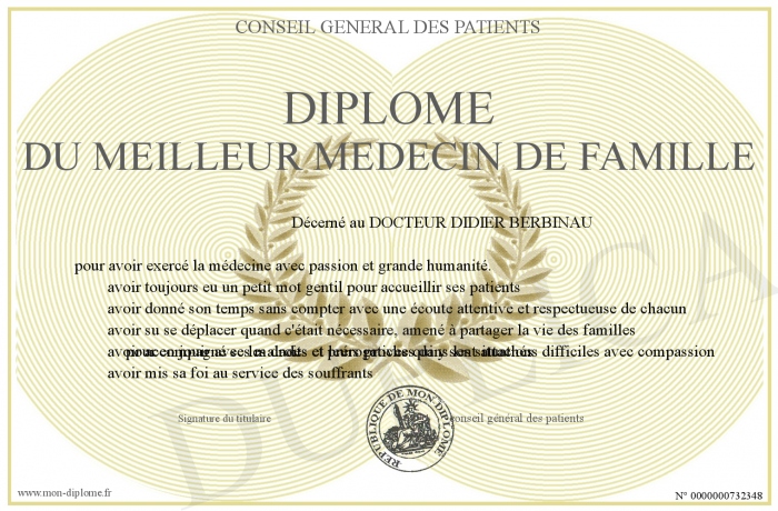 Envoyez par email votre Diplôme du meilleur médecin de famille personalisé