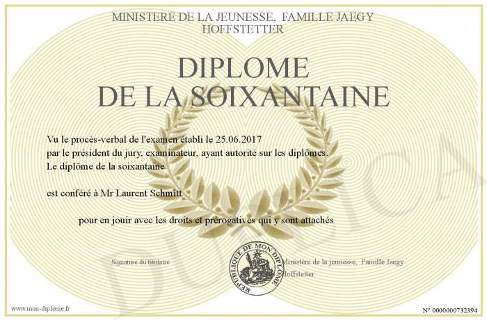 Envoyez par email votre Diplôme de la soixantaine personalisé
