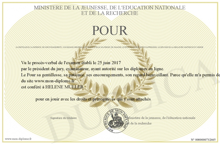 Envoyez par email votre Pour sa gentillesse, sa patience, ses encouragements, son regard bienveillant. Parce qu'elle m'a permis de grandir, qu'elle m'a donné envie d'apprendre, le DIPLOME DE LA MEILLEURE MAITRESSE DU MONDE personalisé