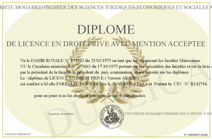 Envoyez par email votre Diplome de licence En Droit Privé avec mention Acceptée personalisé