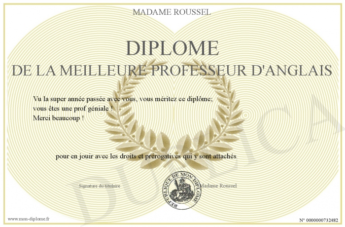 Envoyez par email votre Diplôme de la meilleure professeur d'anglais personalisé