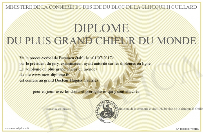 Envoyez par email votre Diplôme du plus grand chieur du monde personalisé