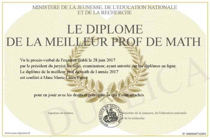 Envoyez par email votre Le diplôme de la meilleur prof de math personalisé