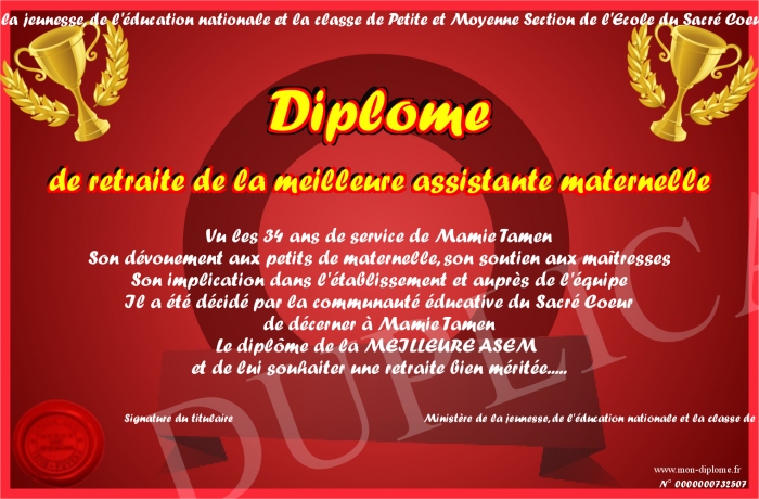 Envoyez par email votre Diplôme de retraite de la meilleure assistante maternelle personalisé