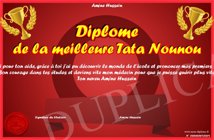 Envoyez par email votre Diplome de la meilleure Tata Nounou personalisé