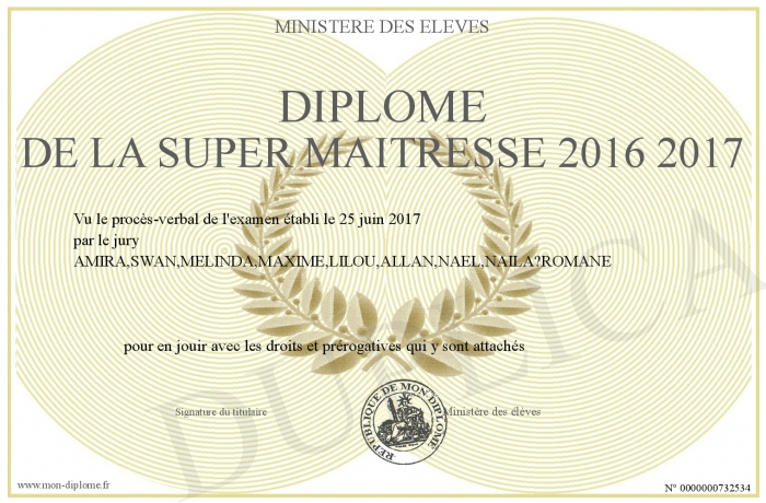Envoyez par email votre Diplôme de la super maitresse 2016 2017 personalisé