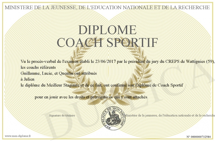 Envoyez par email votre Diplome Coach Sportif personalisé