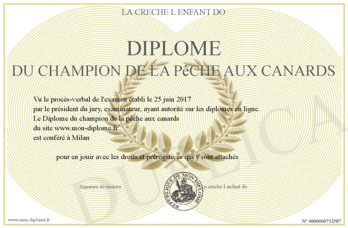 Envoyez par email votre Diplôme du champion de la pêche aux canards personalisé