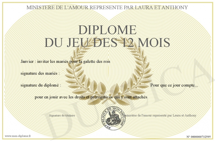 Envoyez par email votre Diplôme du jeu des 12 mois personalisé