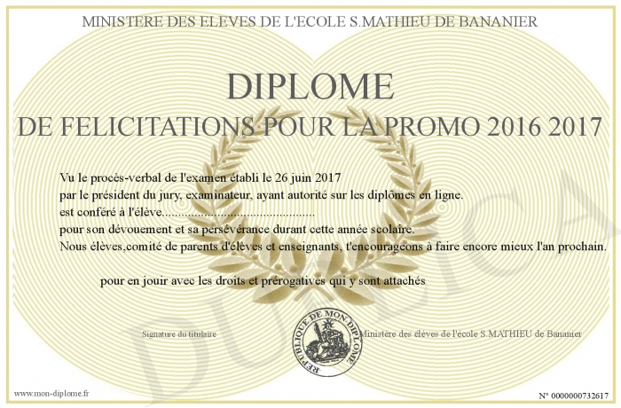 Envoyez par email votre Diplôme de Félicitations pour la Promo 2016 2017 personalisé