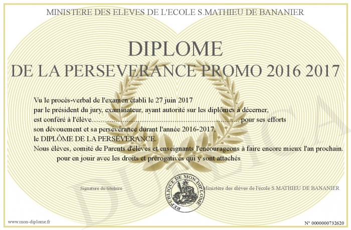 Envoyez par email votre Diplôme de LA PERSEVERANCE Promo 2016 2017 personalisé