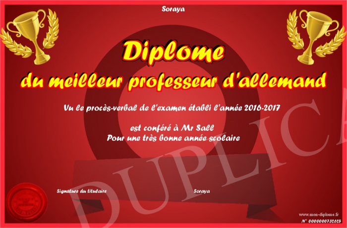 Envoyez par email votre Diplôme du meilleur professeur d'allemand personalisé