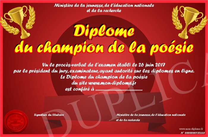 Envoyez par email votre Diplôme du champion de la poésie personalisé