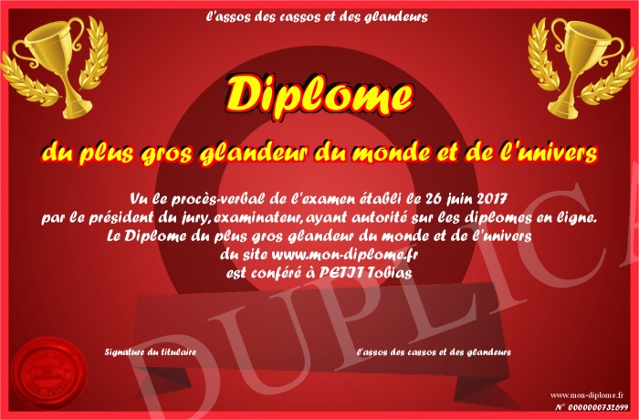 Envoyez par email votre Diplome du plus gros glandeur du monde et de l'univers personalisé