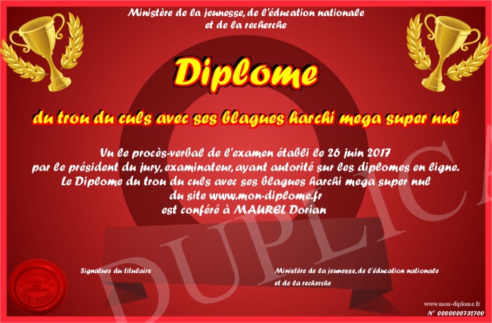 Envoyez par email votre Diplome du trou du culs avec ses blagues harchi mega super nul personalisé