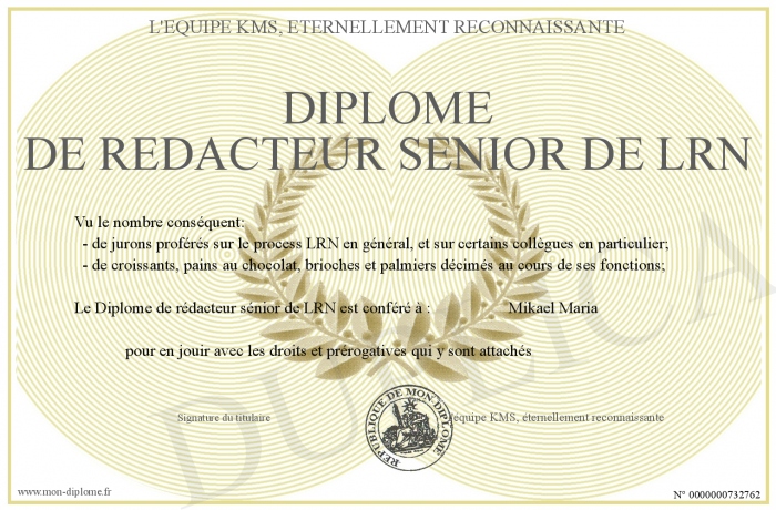 Envoyez par email votre Diplôme de rédacteur sénior de LRN personalisé