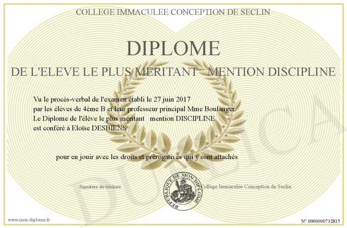 Envoyez par email votre Diplôme de l'élève le plus méritant mention DISCIPLINE personalisé
