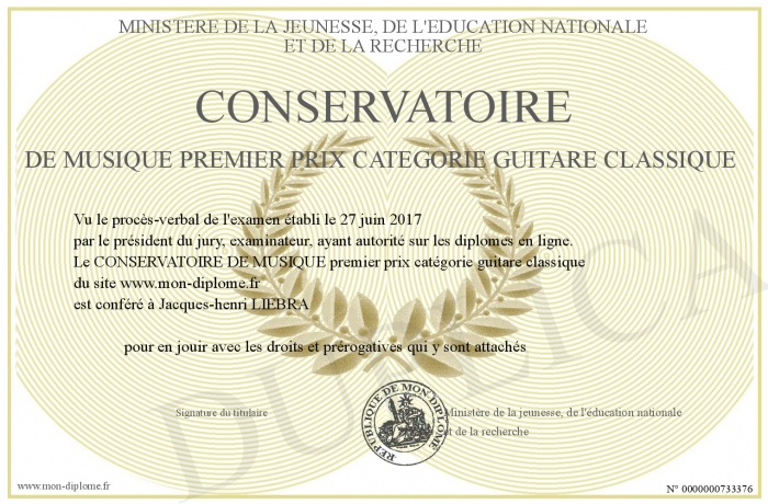 Envoyez par email votre CONSERVATOIRE DE MUSIQUE premier prix catégorie guitare classique personalisé