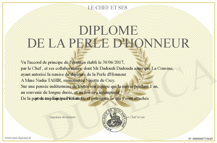 Envoyez par email votre Diplôme de la Perle d'Honneur personalisé