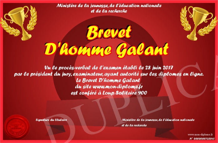 Envoyez par email votre Brevet D'homme Galant personalisé