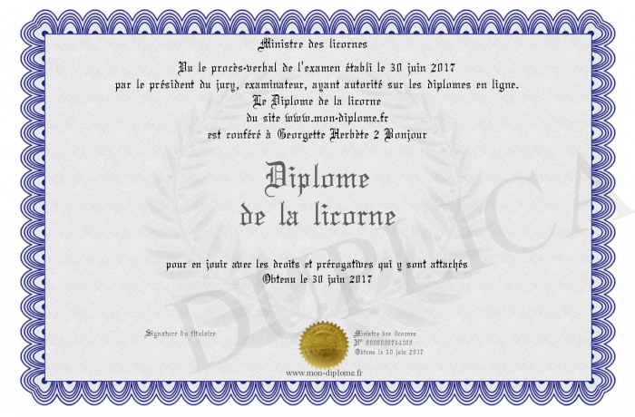 Envoyez par email votre Diplôme de la licorne personalisé