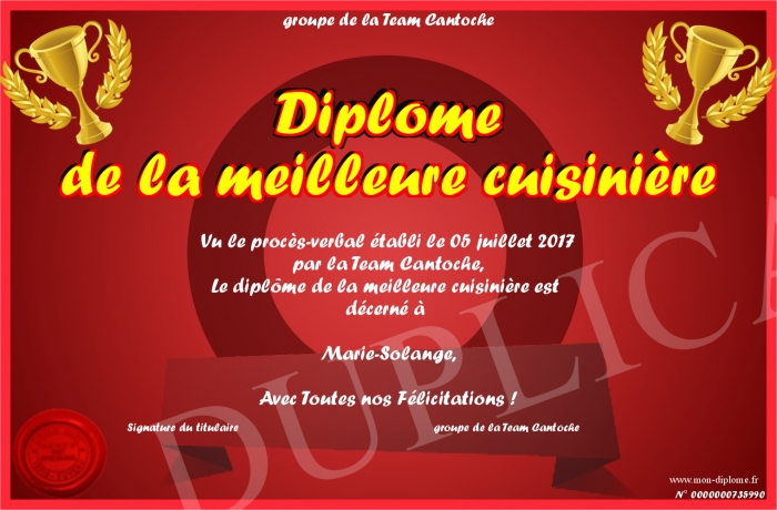 Envoyez par email votre Diplôme de la meilleure cuisinière personalisé
