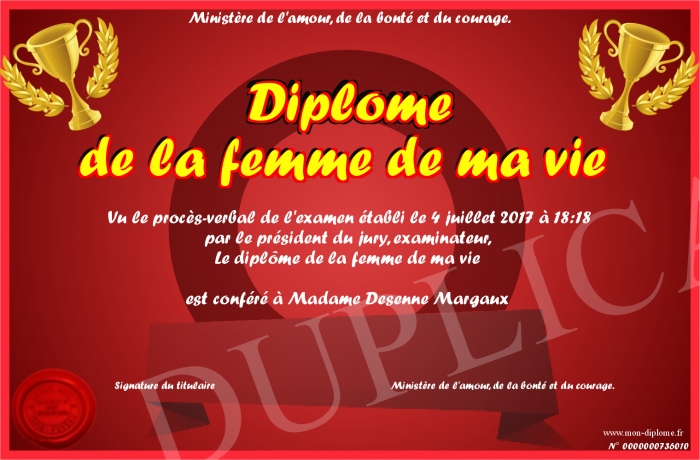 Envoyez par email votre Diplôme de la femme de ma vie personalisé