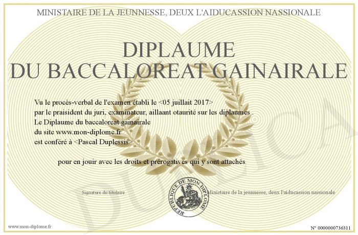 Envoyez par email votre Diplaume du baccaloreat gainairale personalisé