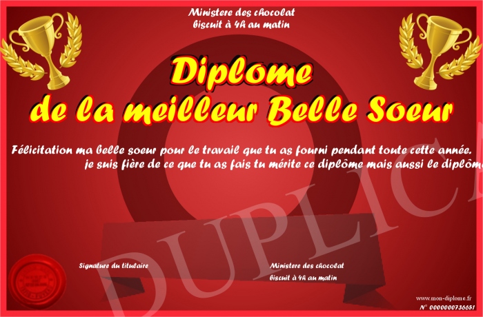 Envoyez par email votre Diplôme de la meilleur Belle Soeur personalisé