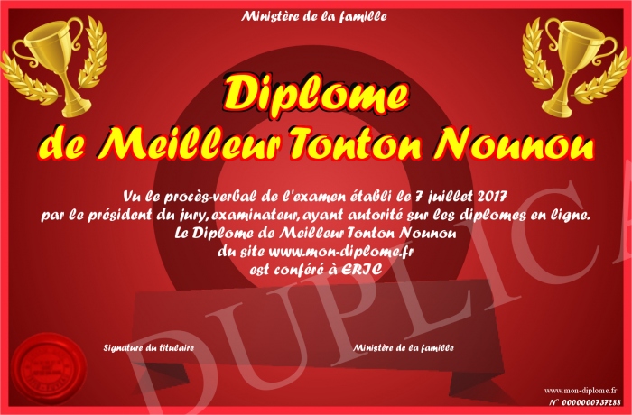 Envoyez par email votre Diplome de Meilleur Tonton Nounou personalisé