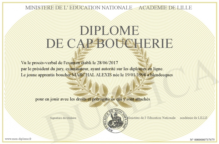 Envoyez par email votre Diplôme de CAP BOUCHERIE personalisé
