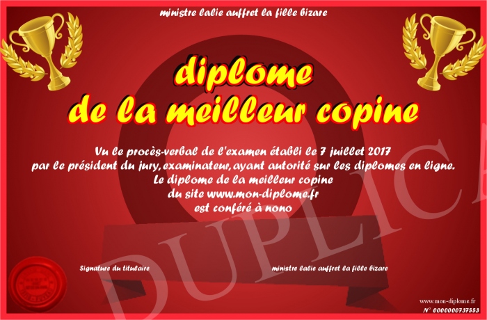 Envoyez par email votre diplome de la meilleur copine personalisé