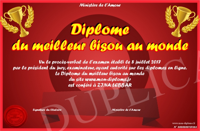 Envoyez par email votre Diplôme du meilleur bisou au monde personalisé