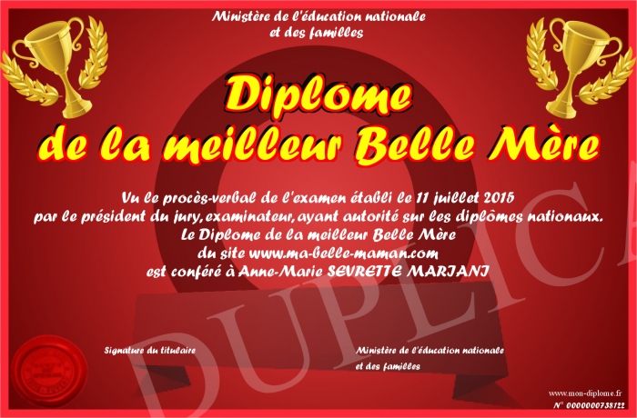 Envoyez par email votre Diplôme de la meilleur Belle Mère personalisé