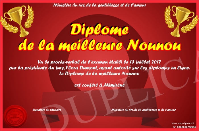 Envoyez par email votre Diplome de la meilleure Nounou personalisé