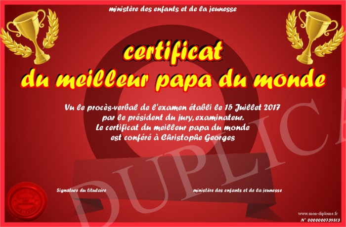 Envoyez par email votre certificat du meilleur papa du monde personalisé
