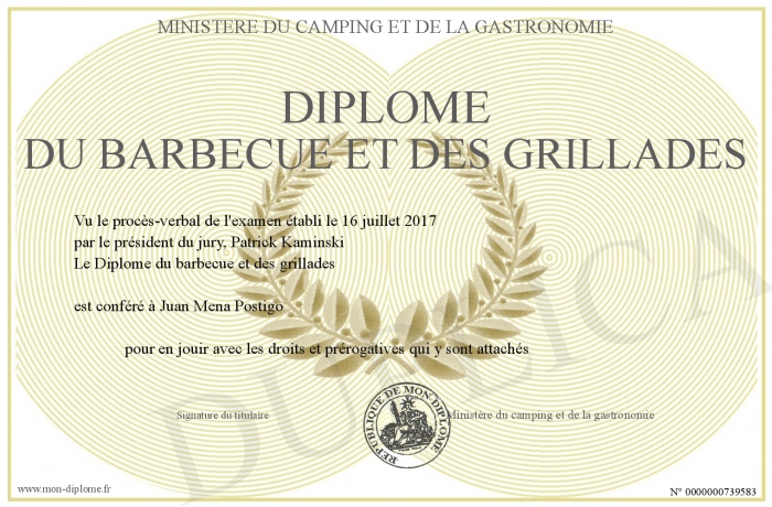 Envoyez par email votre Diplôme du barbecue et des grillades personalisé