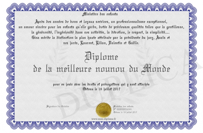 Envoyez par email votre Diplôme de la meilleure nounou du Monde personalisé