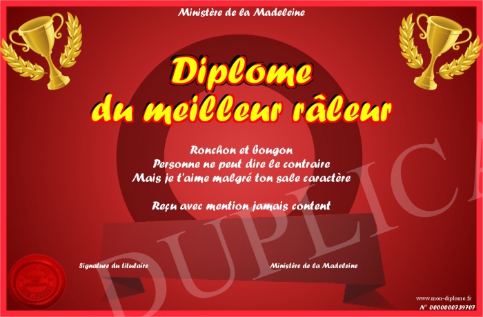Envoyez par email votre Diplôme du meilleur râleur personalisé
