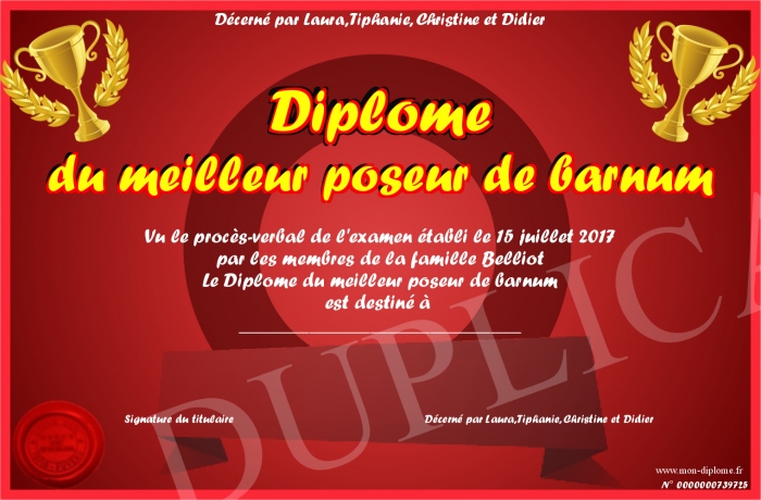 Envoyez par email votre Diplôme du meilleur poseur de barnum personalisé