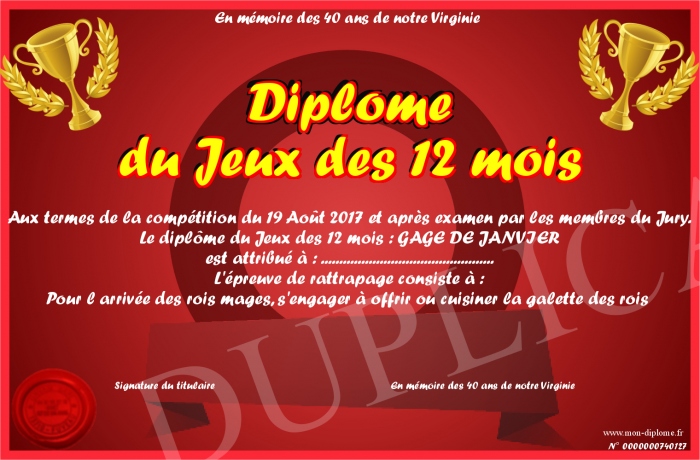 Envoyez par email votre Diplôme du Jeux des 12 mois personalisé