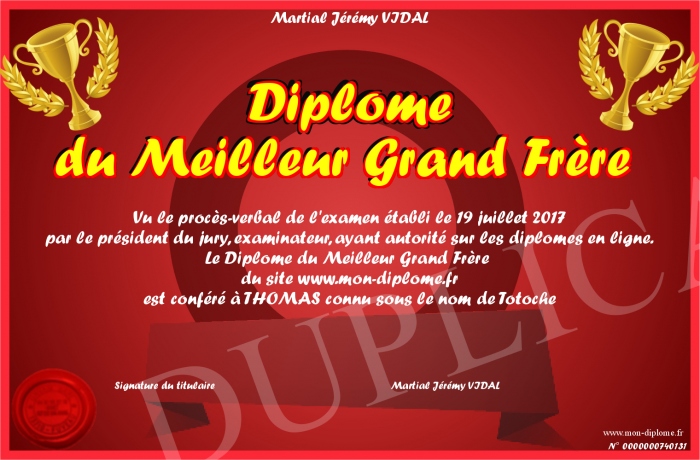 Envoyez par email votre Diplome du Meilleur Grand Frère personalisé