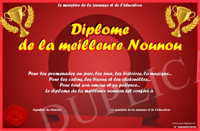 Envoyez par email votre Diplome de la meilleure Nounou personalisé