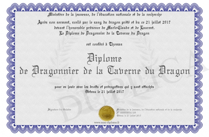 Envoyez par email votre Diplôme de Dragonnier de la Taverne du Dragon personalisé