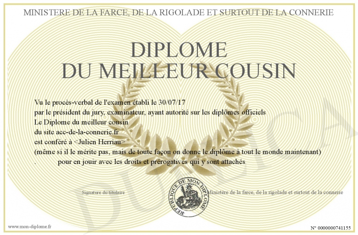 Envoyez par email votre Diplôme du meilleur cousin personalisé