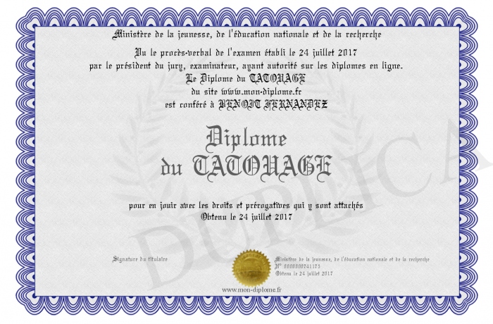 Envoyez par email votre Diplôme du TATOUAGE personalisé