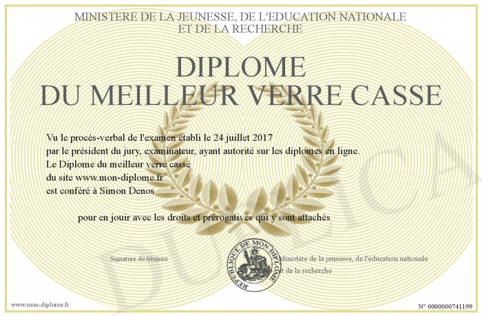 Envoyez par email votre Diplôme du meilleur verre cassé personalisé